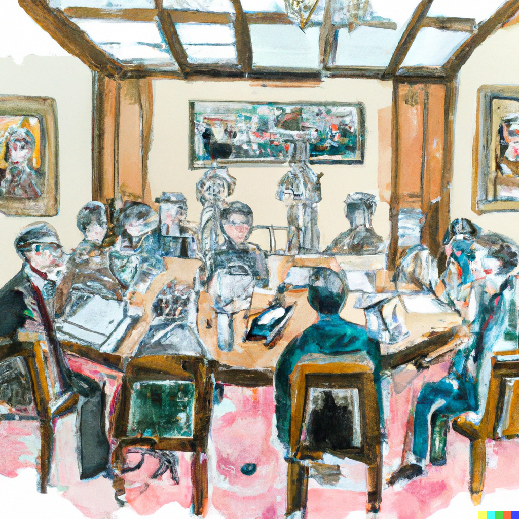 - a watercolor painting depicting the first meeting of faculty librarians to discuss AI platforms
