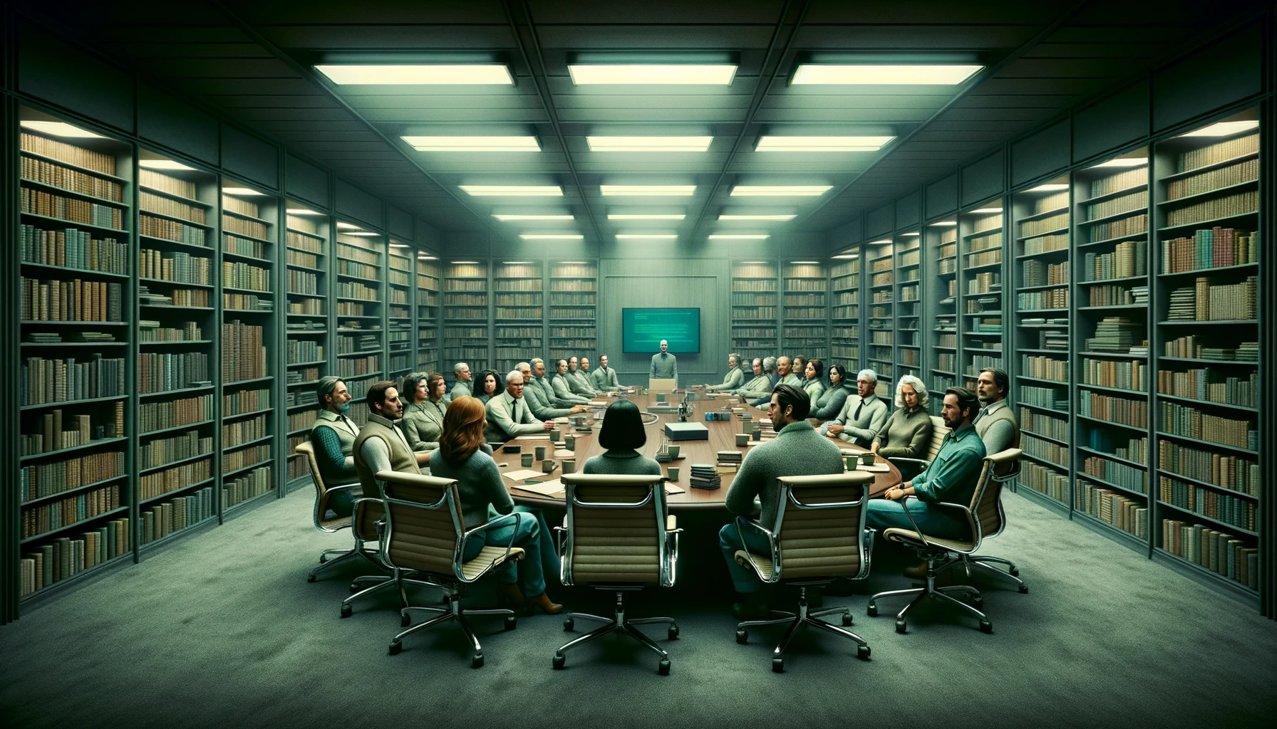 - Picture of librarians in a conference room discussing AI and the future of their profession with a research computing specialist. Refined: A bleak, 1990s-style corporate conference room, devoid of bookshelves, with haphazard decorations, creating a stark and utilitarian atmosphere.